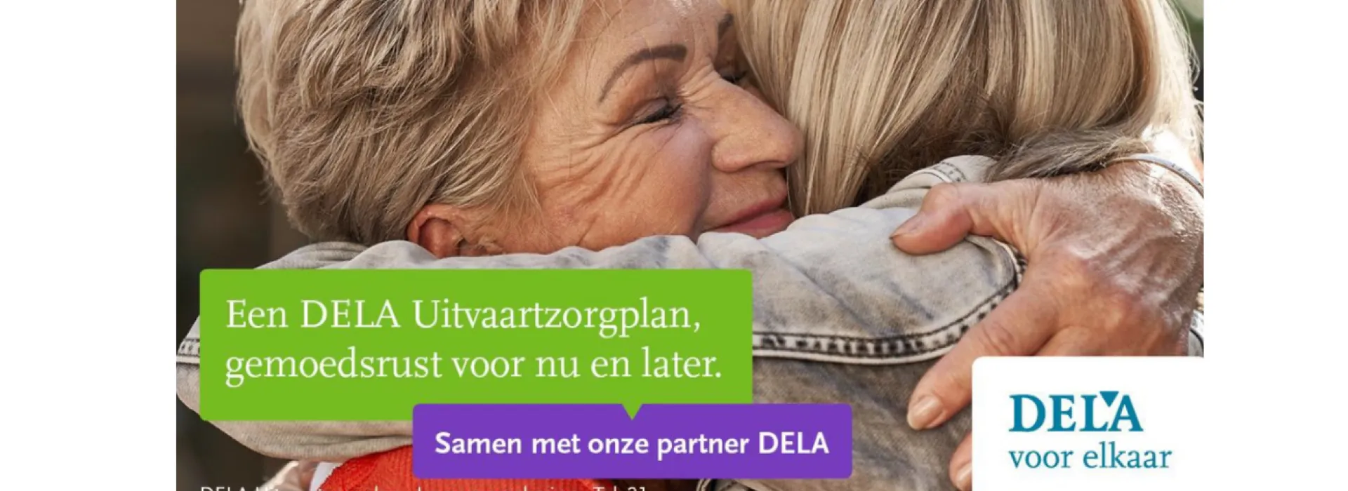 DELA Natura- en levensverzekeringen N.V. – Belgisch bijkantoor (ondernemingsnr. 0665.931.229) gelegen te Noorderplaats 5 bus 2 te 2000 Antwerpen, bijkantoor van DELA Natura- en levensverzekeringen N.V., vennootschap naar NL recht (KvK-nummer 17078393), gelegen te Oude Stadsgracht 1, 5611DD Eindhoven, NL, toegelaten voor Tak 21 levensverzekeringen onder codenr. 2864; fabrikant DELA Uitvaartzorgplan, levensverzekering Tak 21 onderworpen aan BE recht – dekt levenslang uw uitvaartkosten voor het bedrag waarvoor u verzekerd bent. Men is niet gedekt voor een overlijden dat het gevolg is van een uitgesloten risico, met name zelfmoord binnen het jaar na de inwerkingtreding van de polis; vrijwillige deelname aan collectieve gewelddaad/terreur of oorlog (professionele omstandigheden [bv. militairen, politie, brandweer] uitgezonderd); misdaad of wanbedrijf indien men deze als (mede)dader pleegde. Voor extra bijstand, psychologische bijstand, repatriëring & vervroegde terugkeer gelden specifieke beperkingen en uitsluitingen. Deze vindt u terug in de Algemene Voorwaarden. Offerte, premieberekening en Algemene Voorwaarden: www.dela.be en/of uw makelaar. Klachten: contact@dela.be of Ombudsman Verzekeringen (de Meeûsplantsoen 35, 1000 Brussel). Indien u kosteloos een kopie wenst van de Algemene Voorwaarden, gelieve een e-mail te richten aan info@dela.be. Aan deze tekst kunnen geen rechten worden ontleend. Enkel de Algemene en Bijzondere Voorwaarden zijn bindend.
